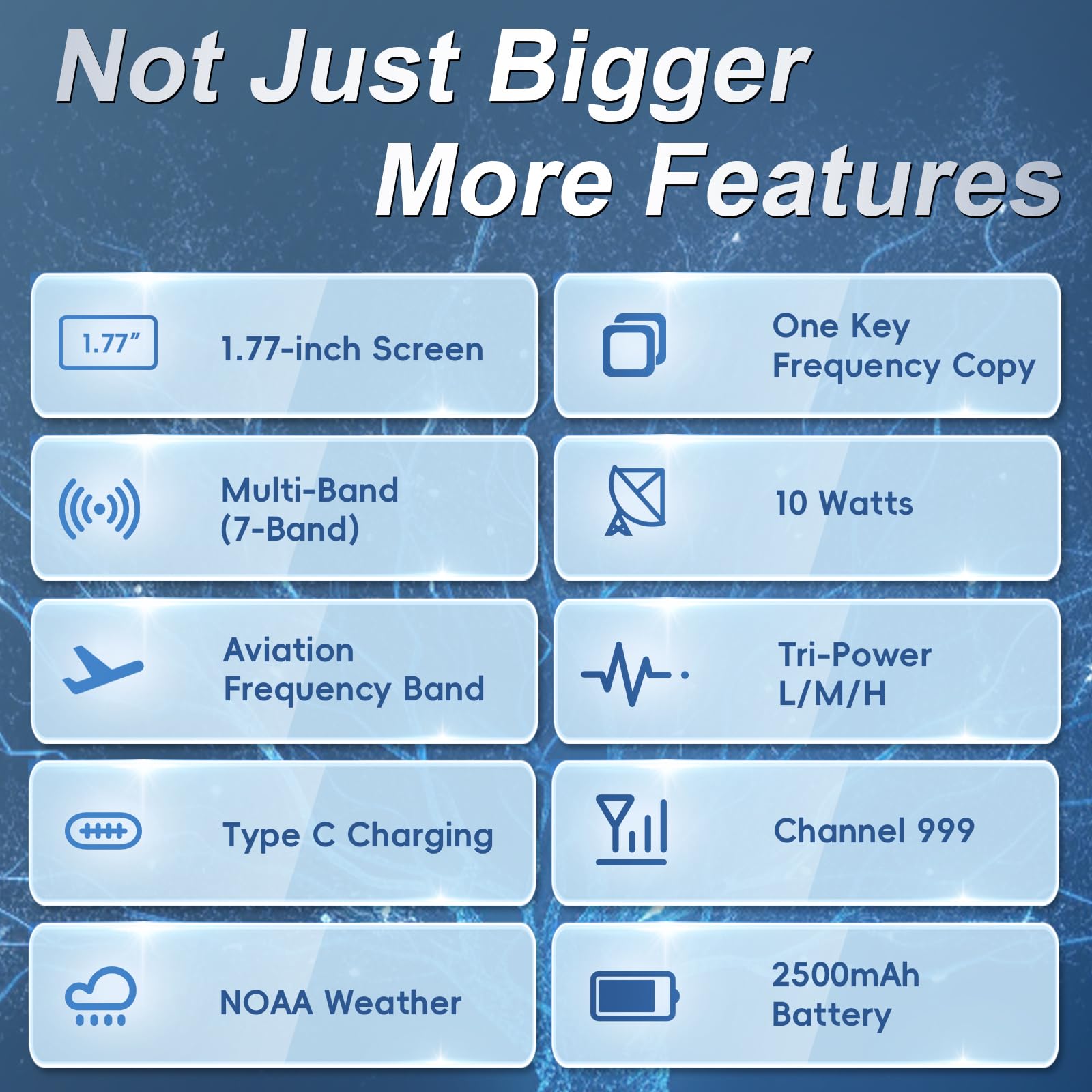 - 💎【Multi Functions】The BAOFENG walkie talkies feature a 1.77" TFT color screen, 999 memory channels, aviation band, scrambling, USB C charging, password protection, stopwatch, DTMF, VOX, LED flashlight, squelch, battery save mode, repeater functions, alarm functions and advanced privacy with 50 CTCSS tones and 104 DCS codes, and more. Long press # for scanning the VFO frequency, channels and FM